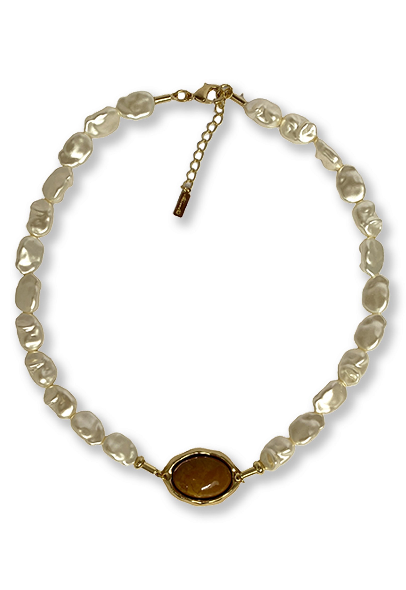 Colar confeccionado com pérolas sintéticas irregulares e pingente resinado na cor caramelo.