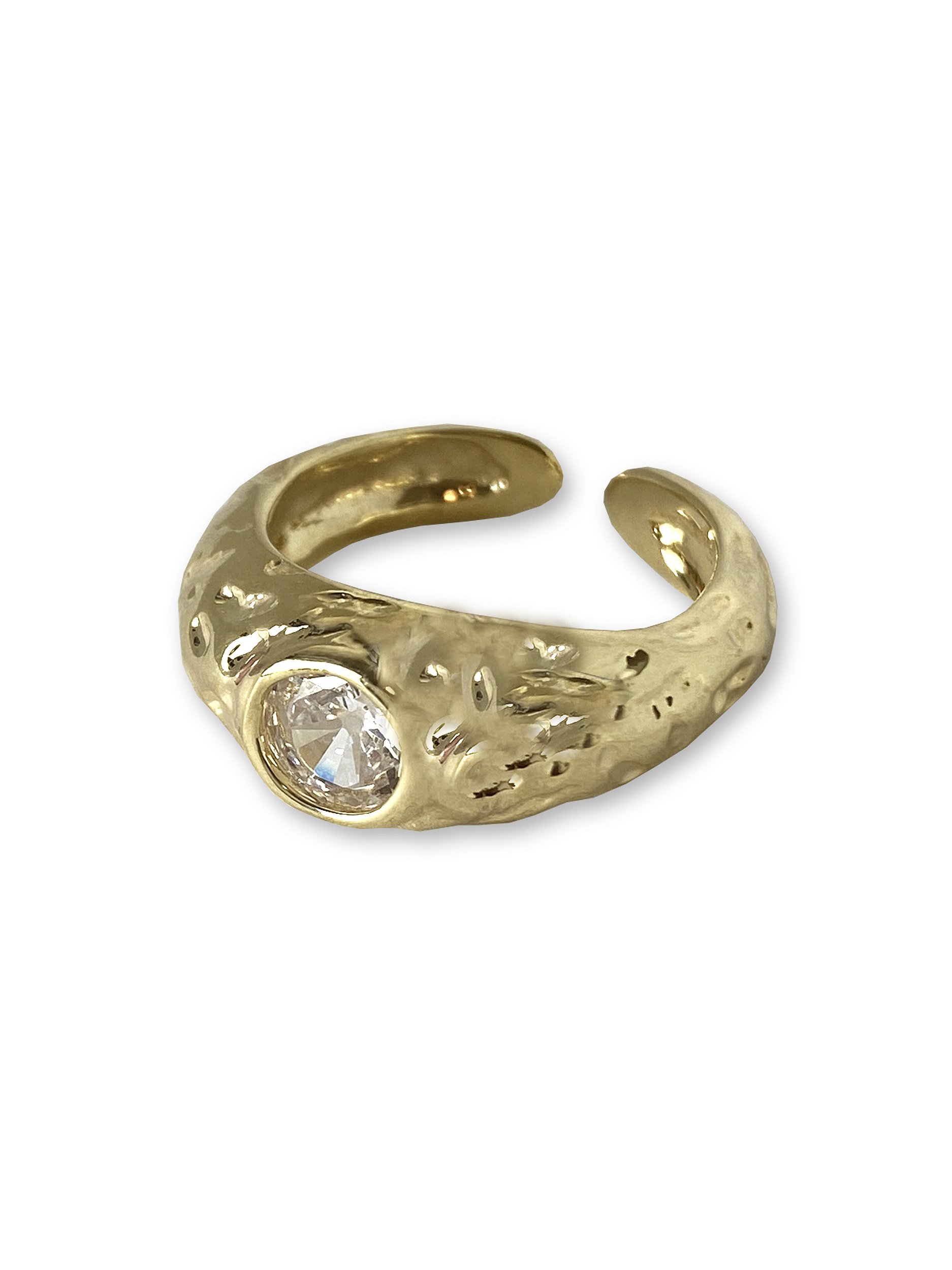 Anel banhado a ouro e antialérgico, com design orgânico e textura martelada que reflete a luz de forma única.