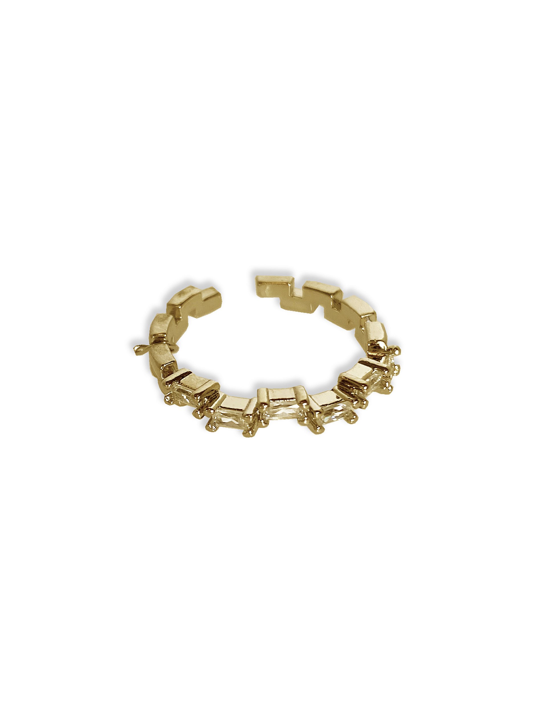 Anel delicado cravejado em zircônias, com regulagem prática que permite ajustar ao dedo com conforto.