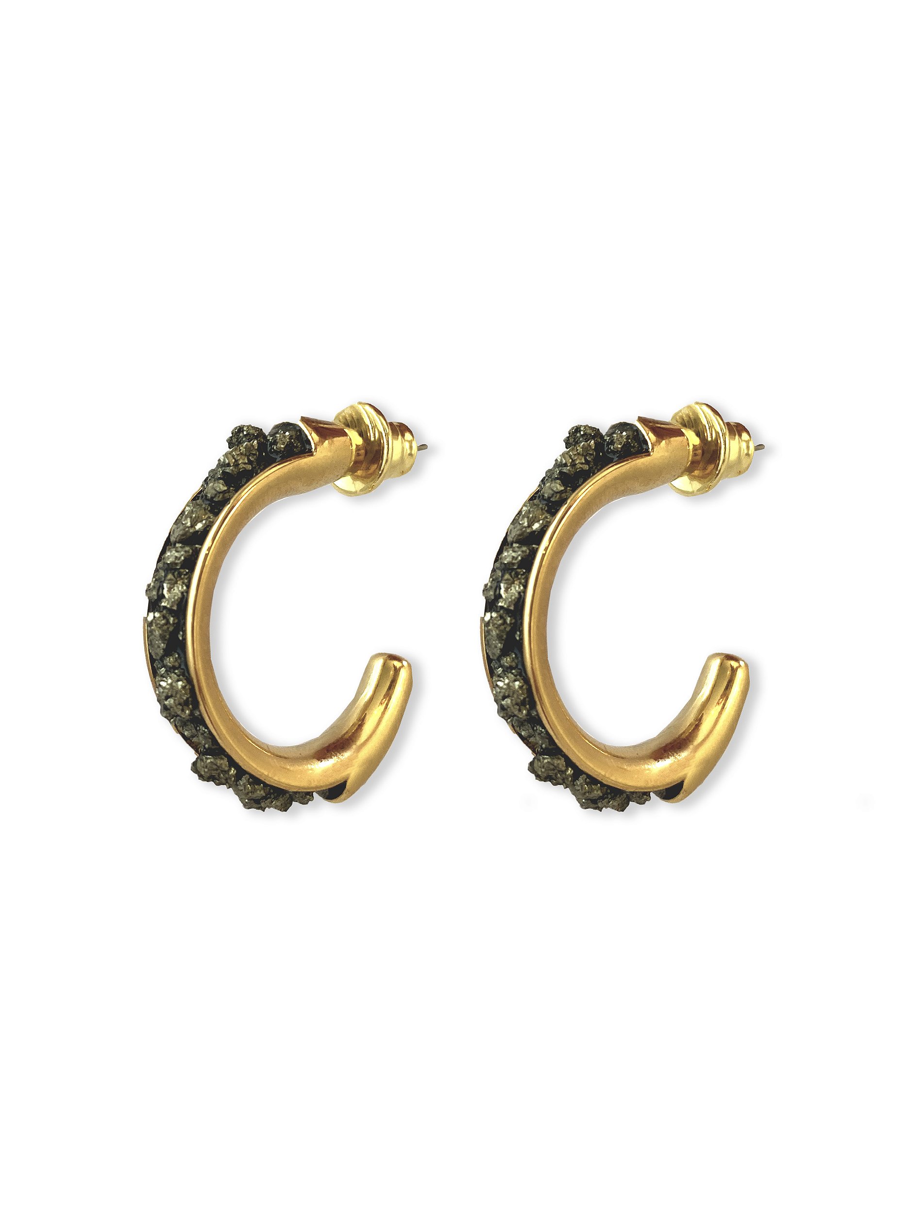 Argola de tamanho médio/grande com aplicação de pedra natural pirita, trazendo textura e um visual mais marcante para a peça.