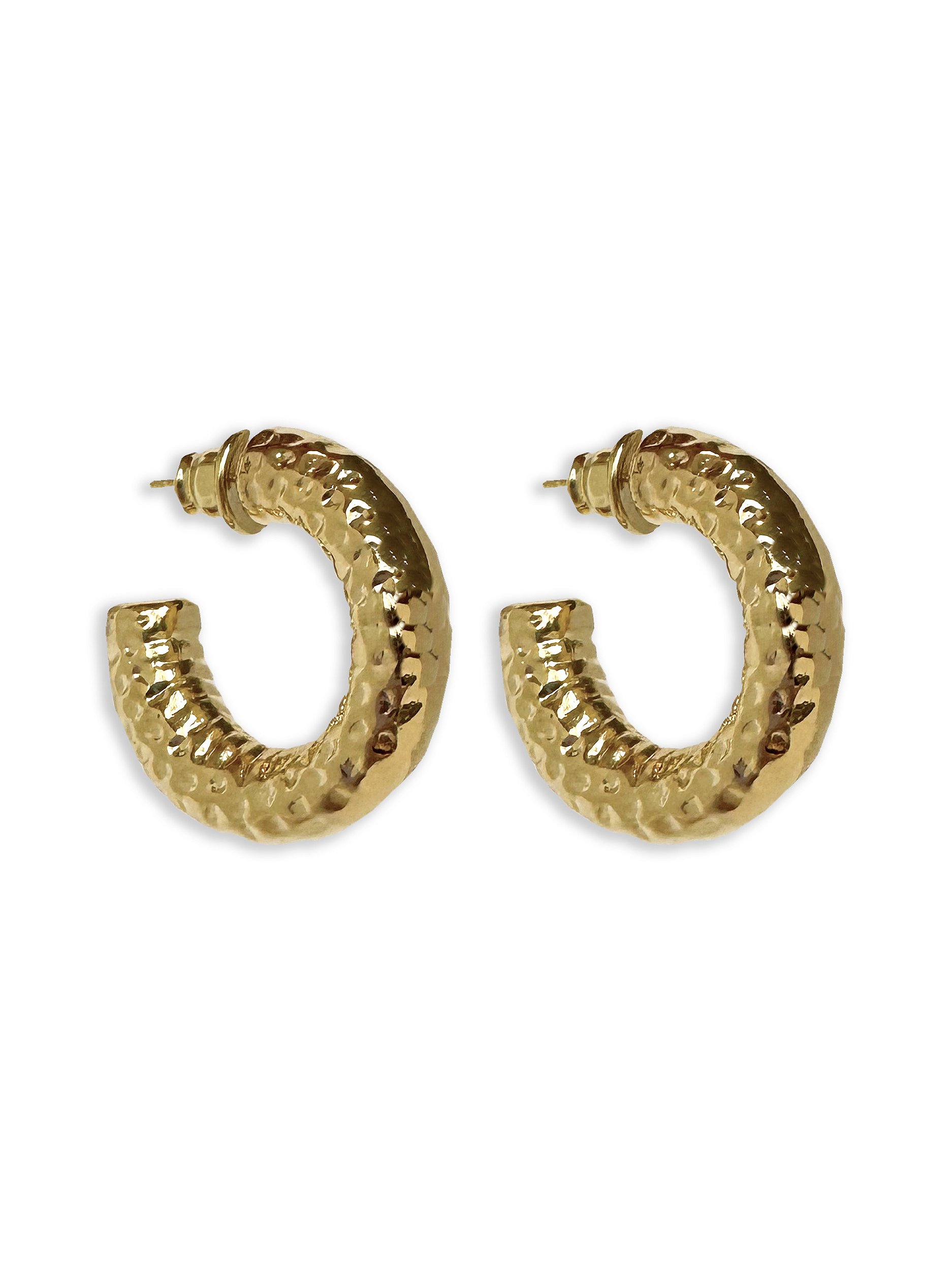 Argola grande com textura orgânica, banhada a ouro e antialérgica.