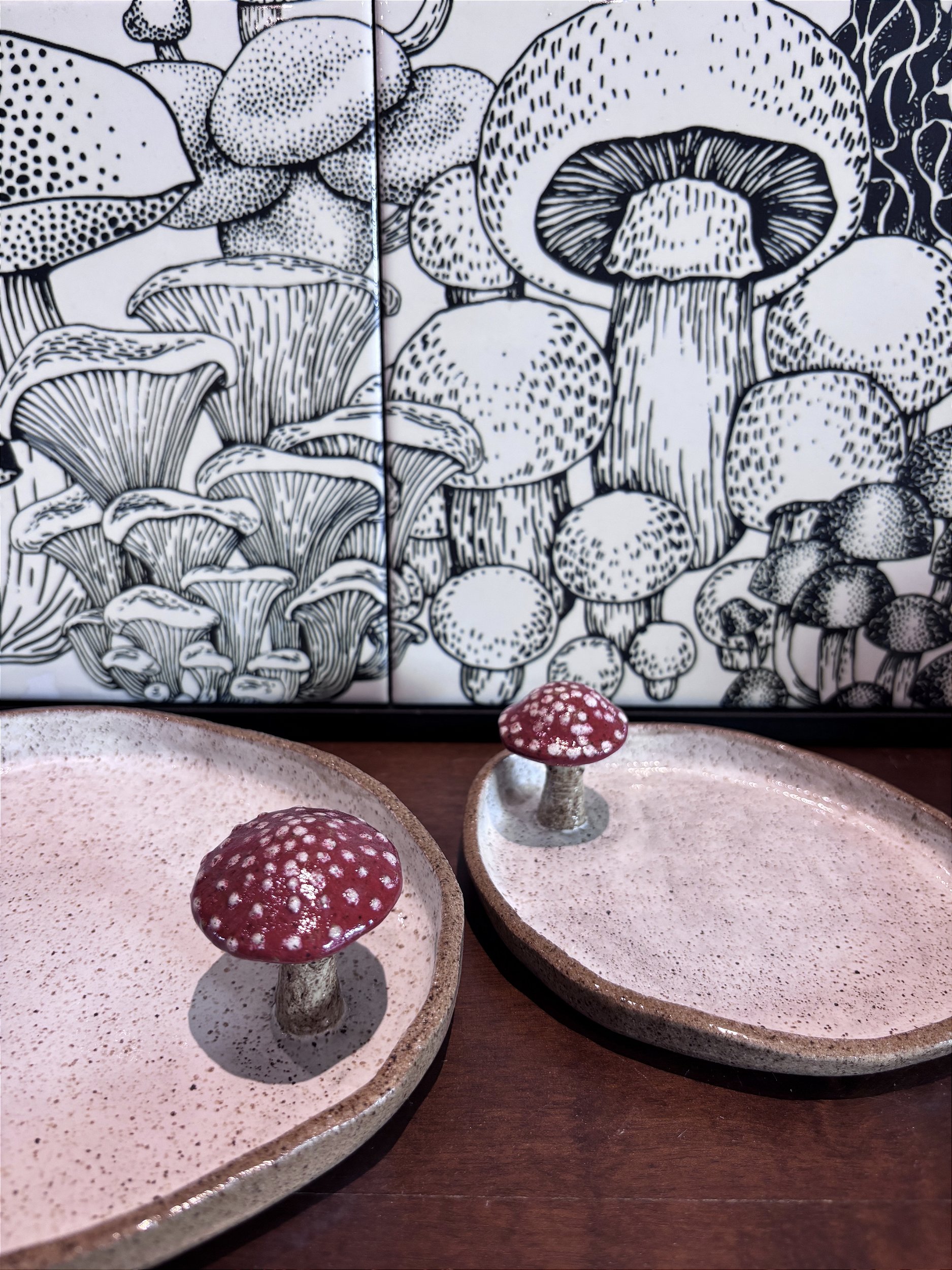 Bandeja de cerâmica confecionada na cor branca com detalhe de cogumelo na cor vermelha.
