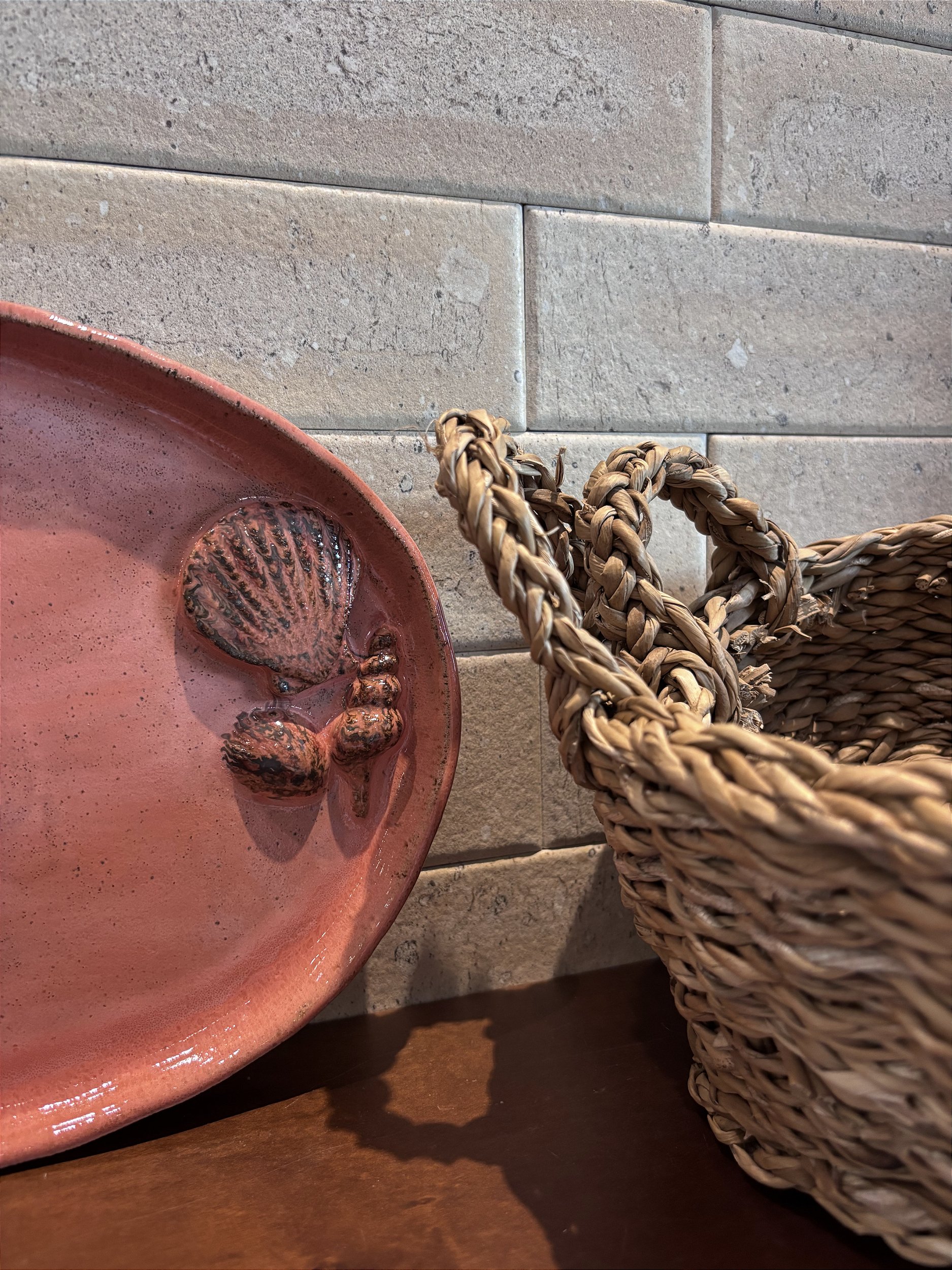 Bandeja de cerâmica confecionada na cor coral com detalhe sobreposto de conchas.
