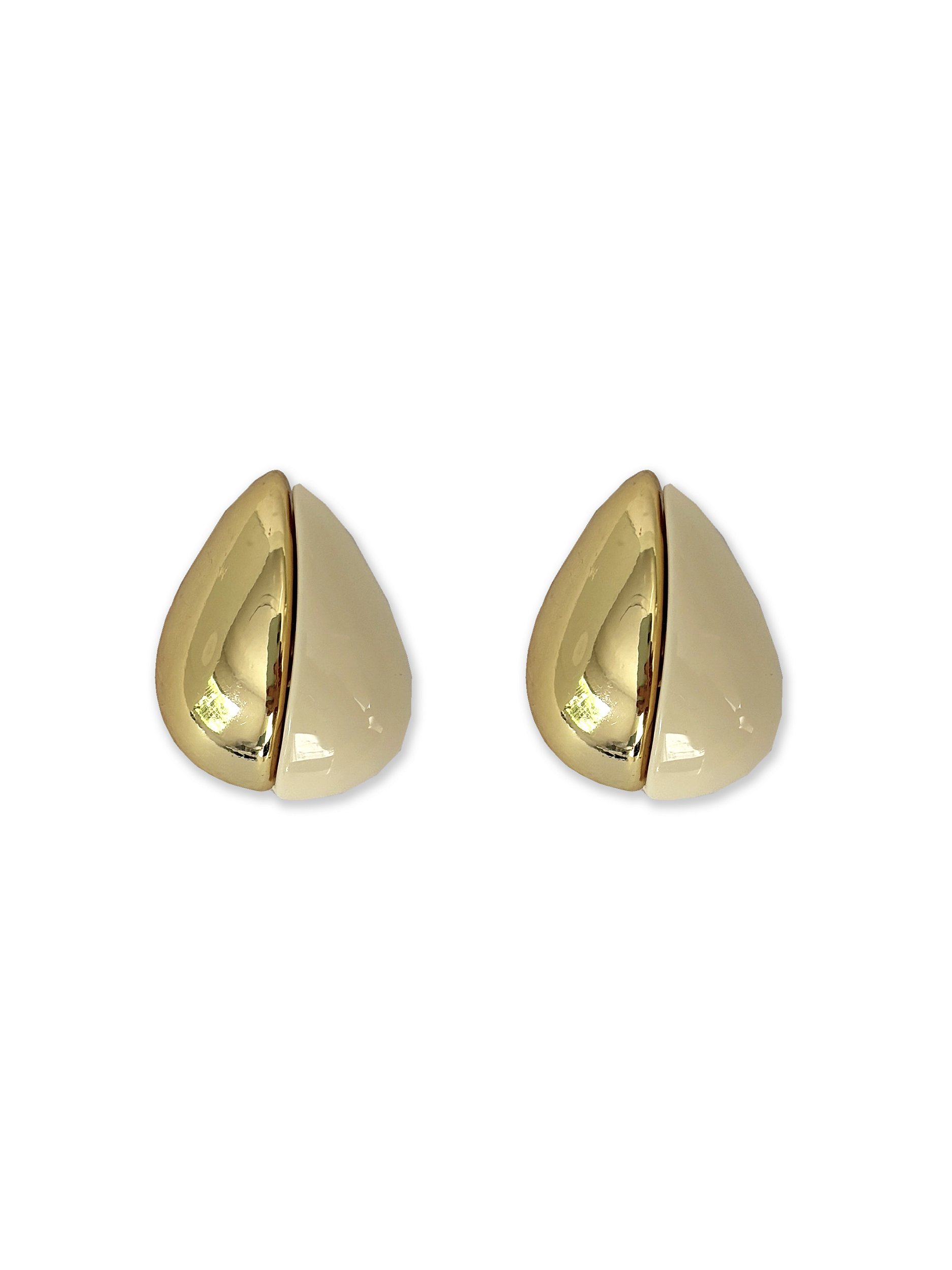 Brinco com design contemporâneo, confeccionado em metal com banho dourado e detalhe em resina off white em formato orgânico. A combinação entre o dourado polido e o tom neutro da resina cria um contraste sofisticado e atemporal.