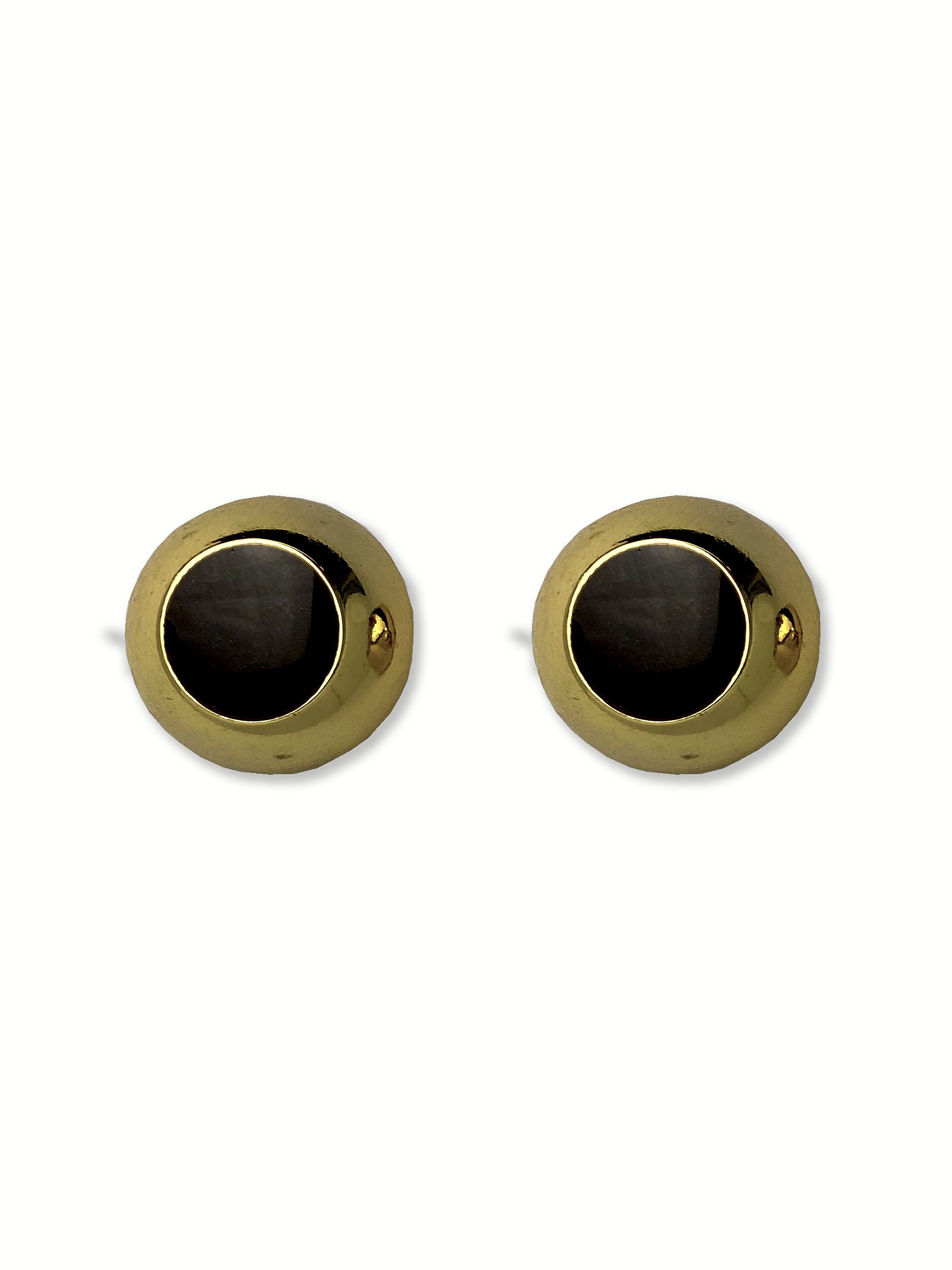 O Brinco Botão possui design redondo com acabamento dourado e detalhe resinado no centro, trazendo um toque moderno e elegante à peça.