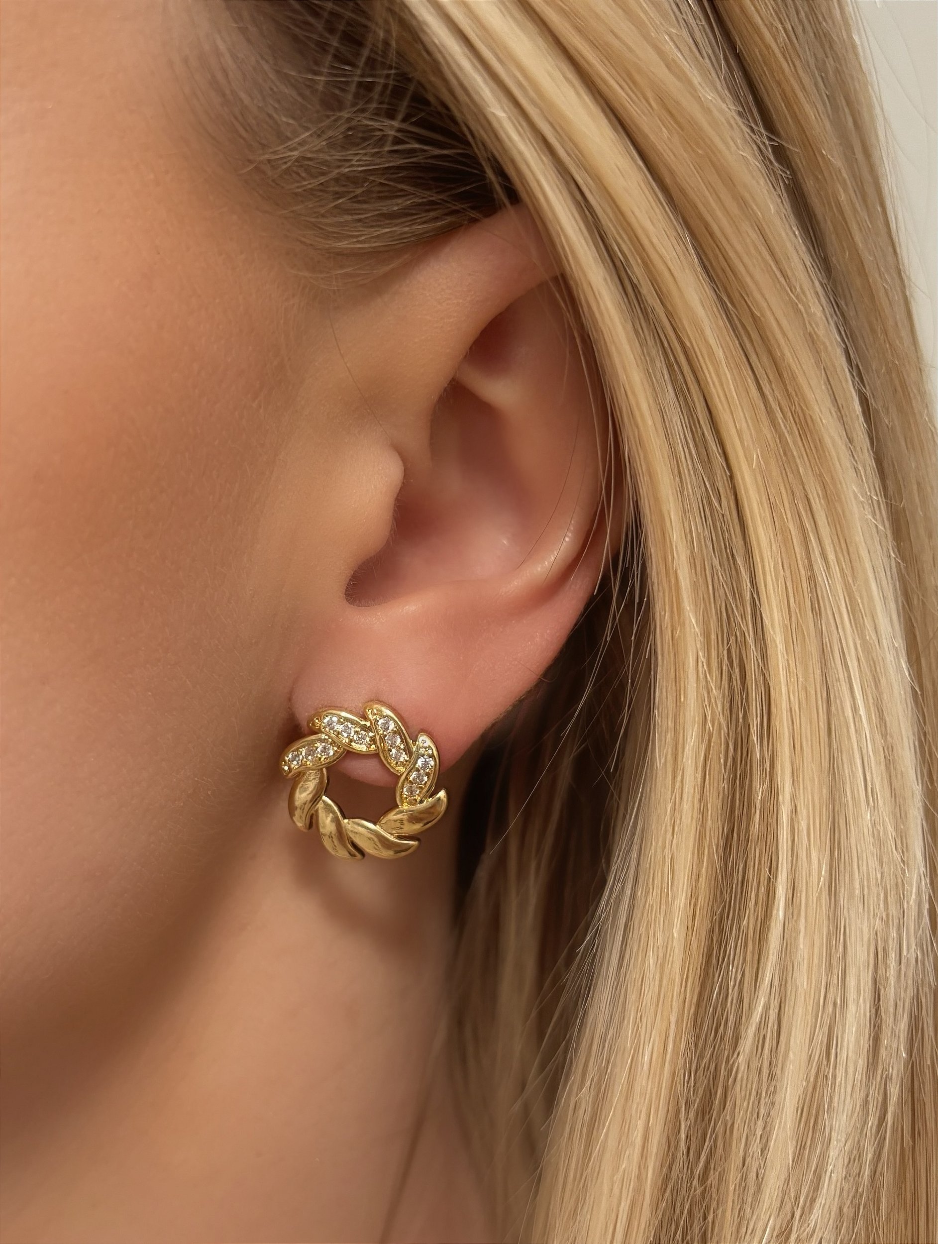 Brinco médio com design em aro de folhas, combinando partes lisas e partes cravejadas em zircônias para criar um brilho sofisticado e elegante.