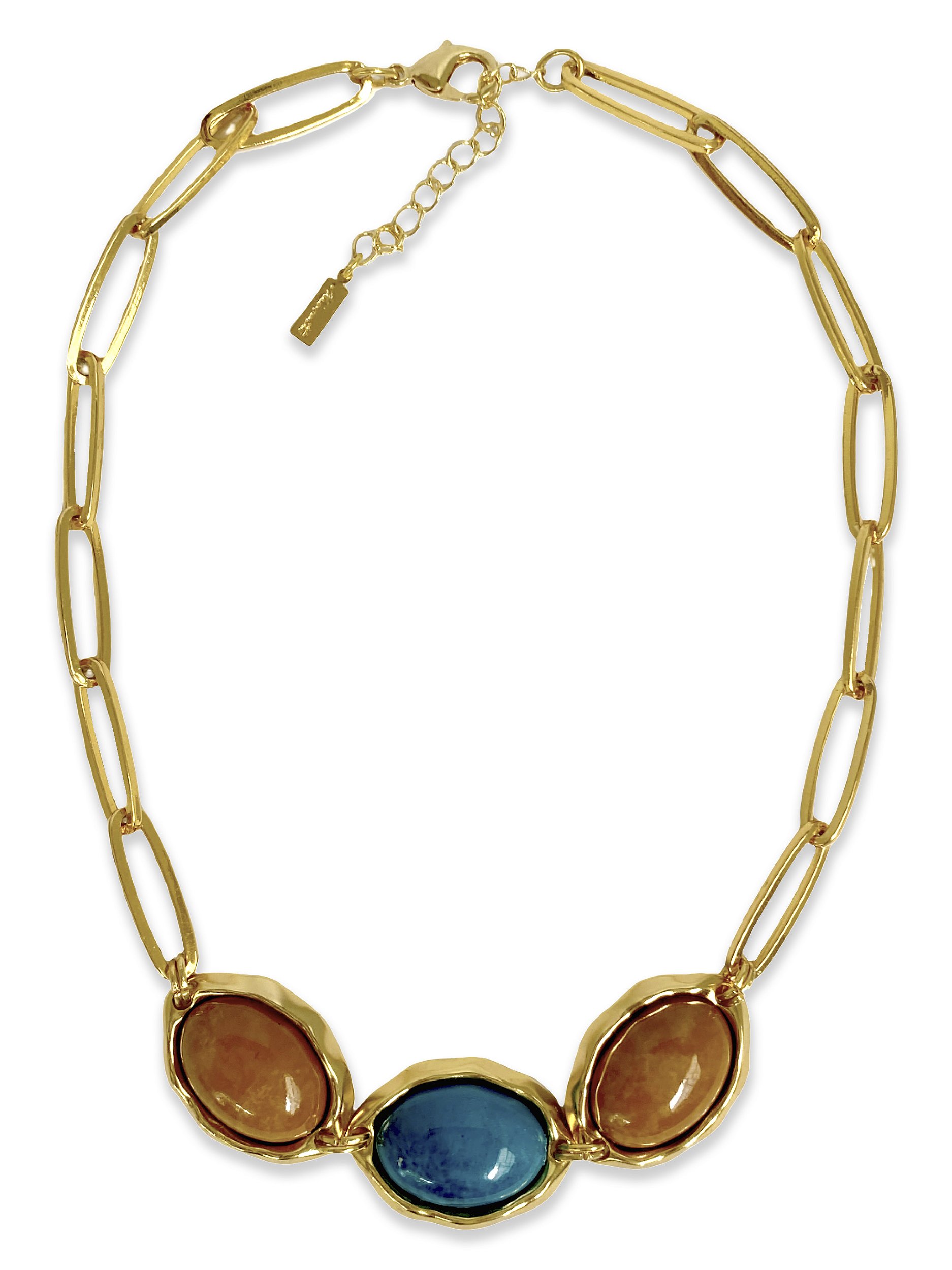 Colar curto com correntaria de elos alongados e pingentes resinados nas cores caramelo e azul marinho, trazendo contraste e personalidade para a peça.