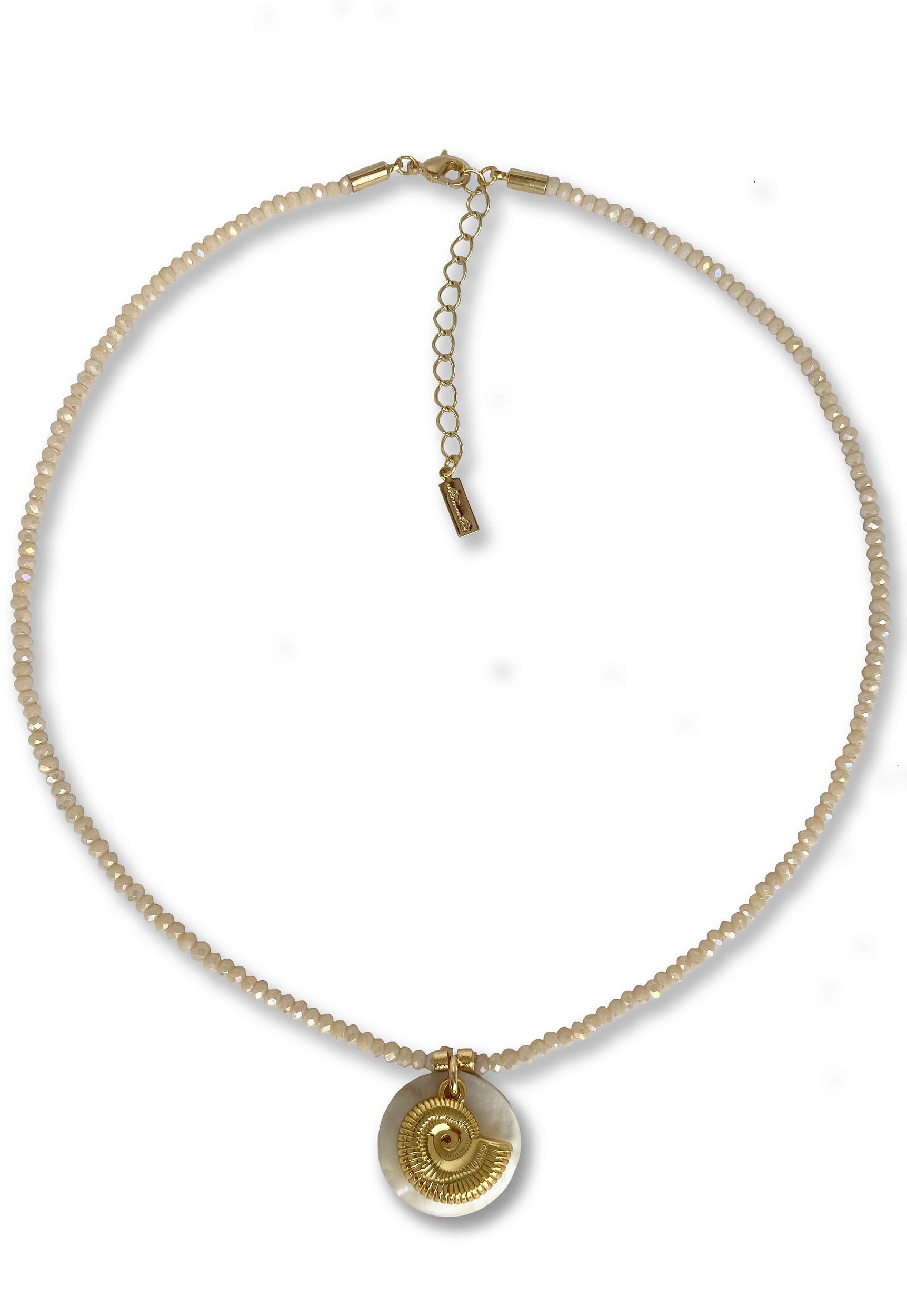 Colar curto confeccionado com mini cristais na cor Off-white (tamanho nº2 dos cristais) com pingente de madrepérola natural e pingente de concha de metal dourado.