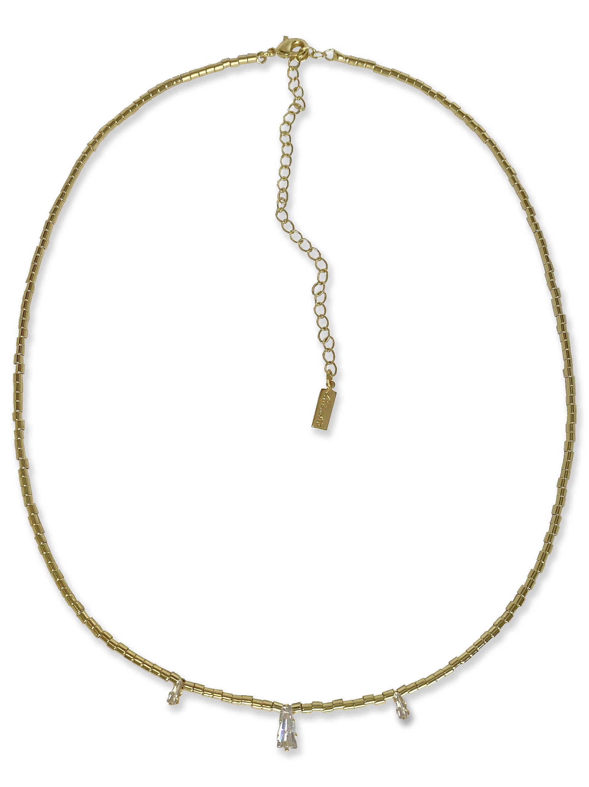 Colar delicado confeccionado com canutilhos metálicos e três pingentes de zircônia baguete.