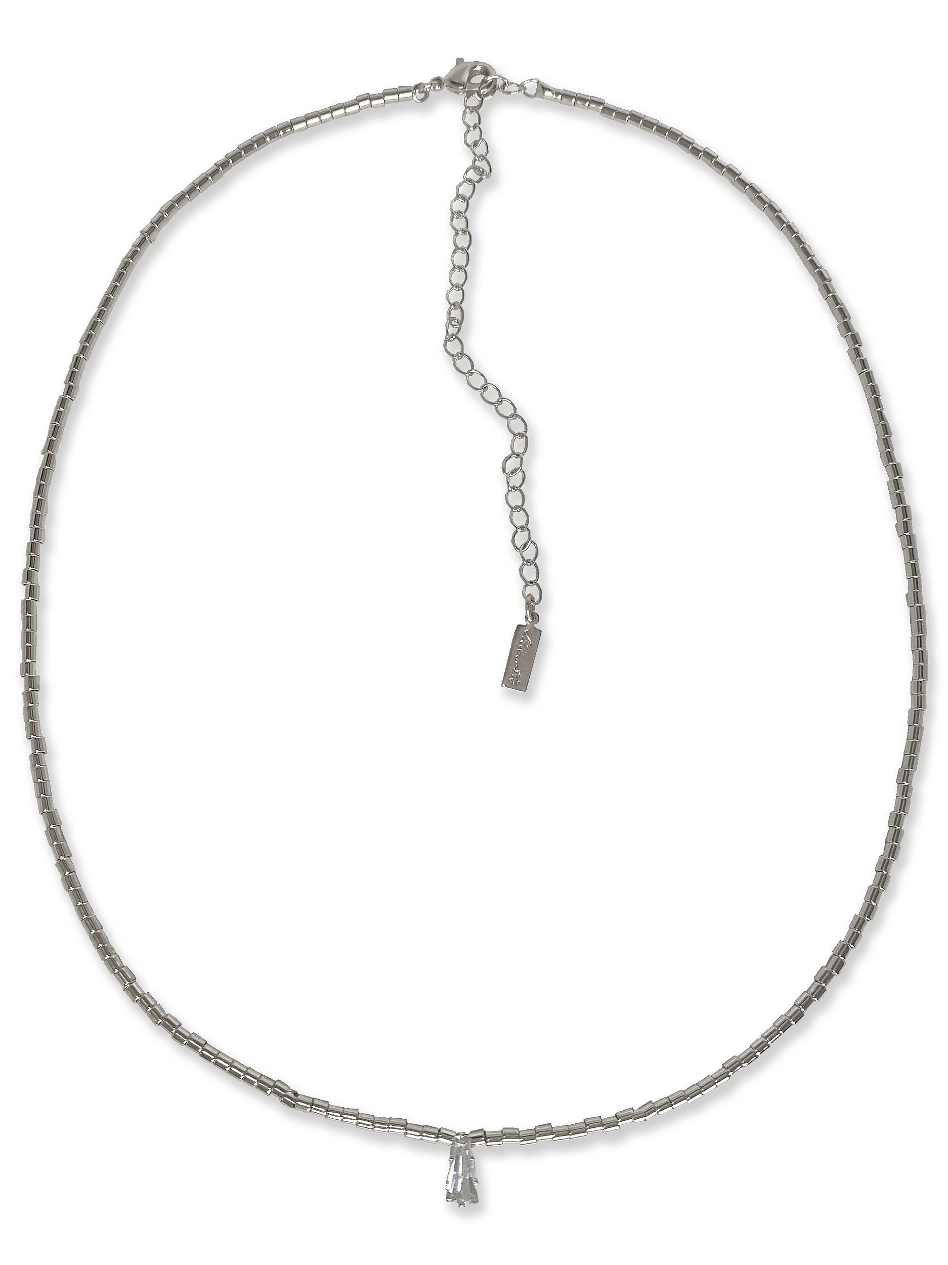 Colar delicado confeccionado com canutilhos metálicos e um pingente de zircônia baguete.