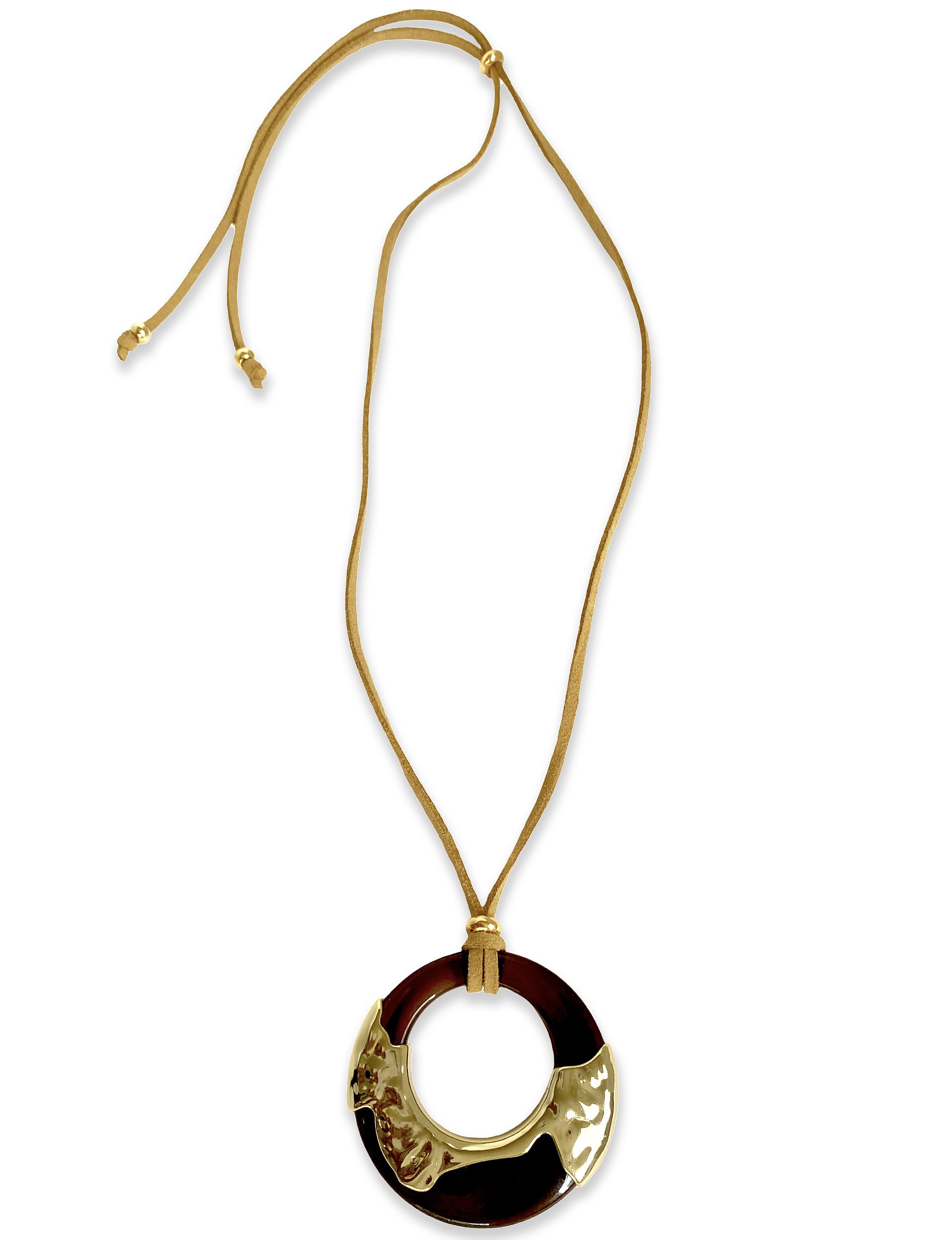 Colar confeccionado em cordão de camurça na cor caramelo com pingente em resina com detalhes em metal.