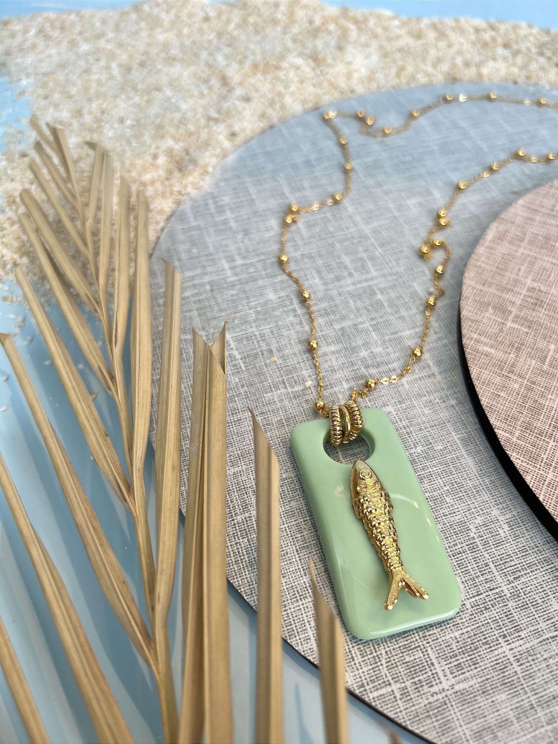 Detalhe de pingente confeccionado com placa de abs verde com aplicação de peixe de metal dourado.