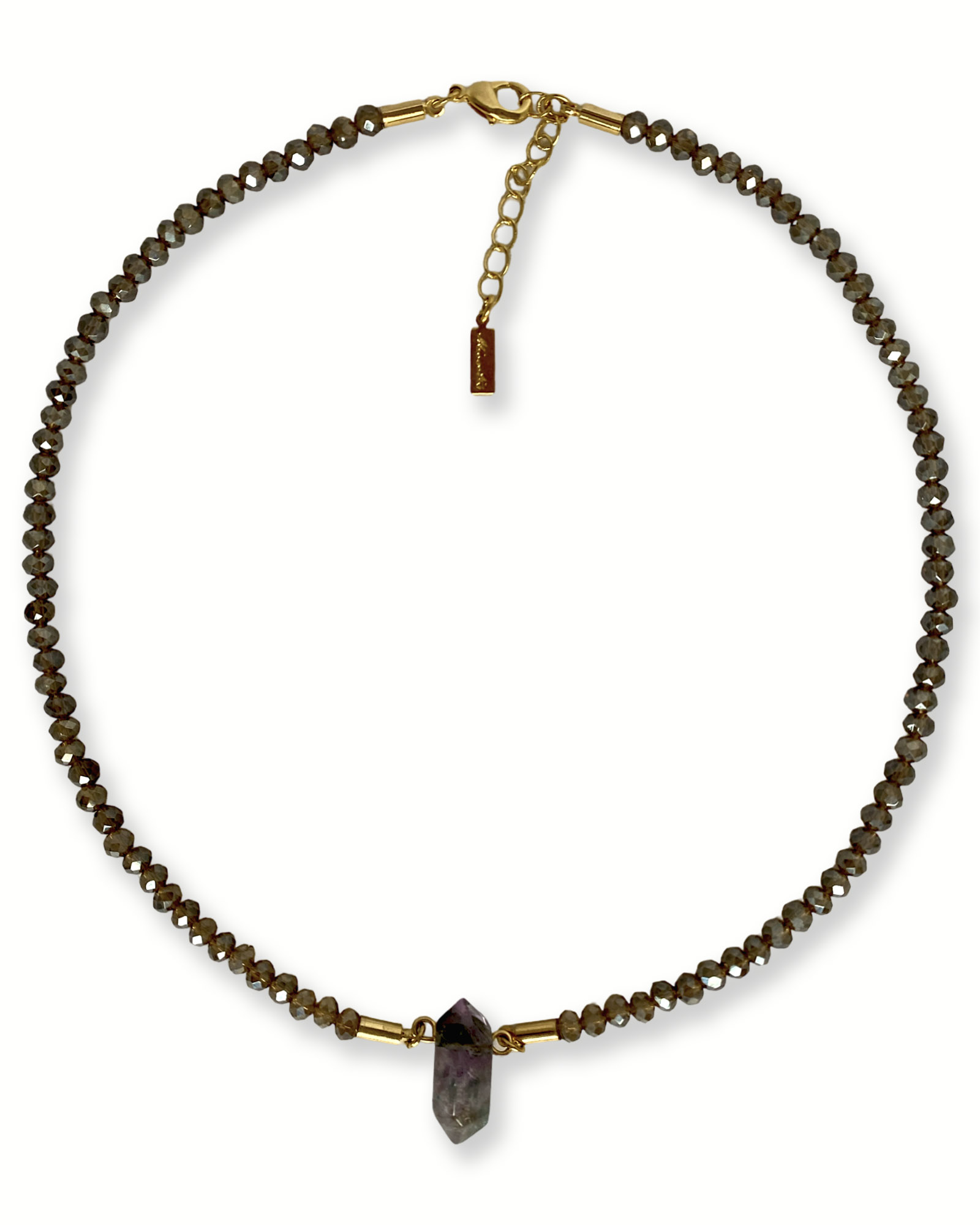 O Colar de Cristais possui design delicado com cristais de vidro tamanho nº4 na cor marrom furta-cor, trazendo brilho sutil e elegante ao visual. O destaque fica para a pedra natural fluorita central, que adiciona personalidade e um toque único à peça.