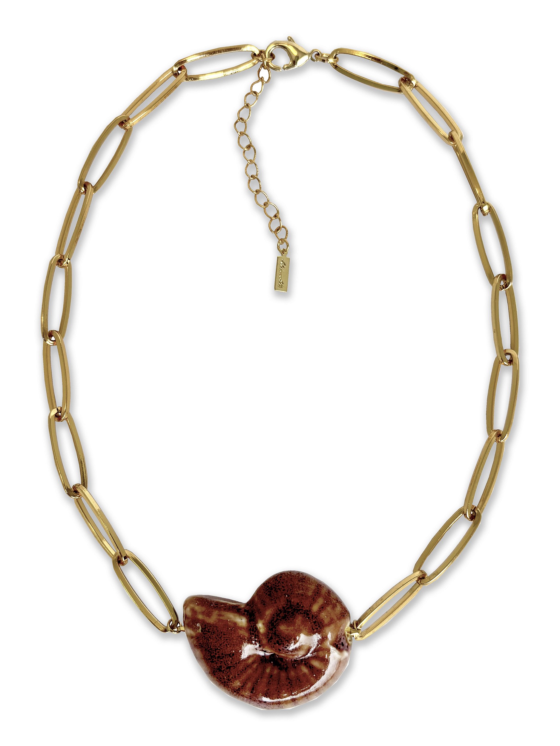 Colar imponente confeccionado em corrente dourada de elos alongados, com banho de ouro e acabamento polido. O destaque fica para o pingente de concha em porcelana artesanal, que evocam a beleza natural do oceano com um toque elegante e moderno.