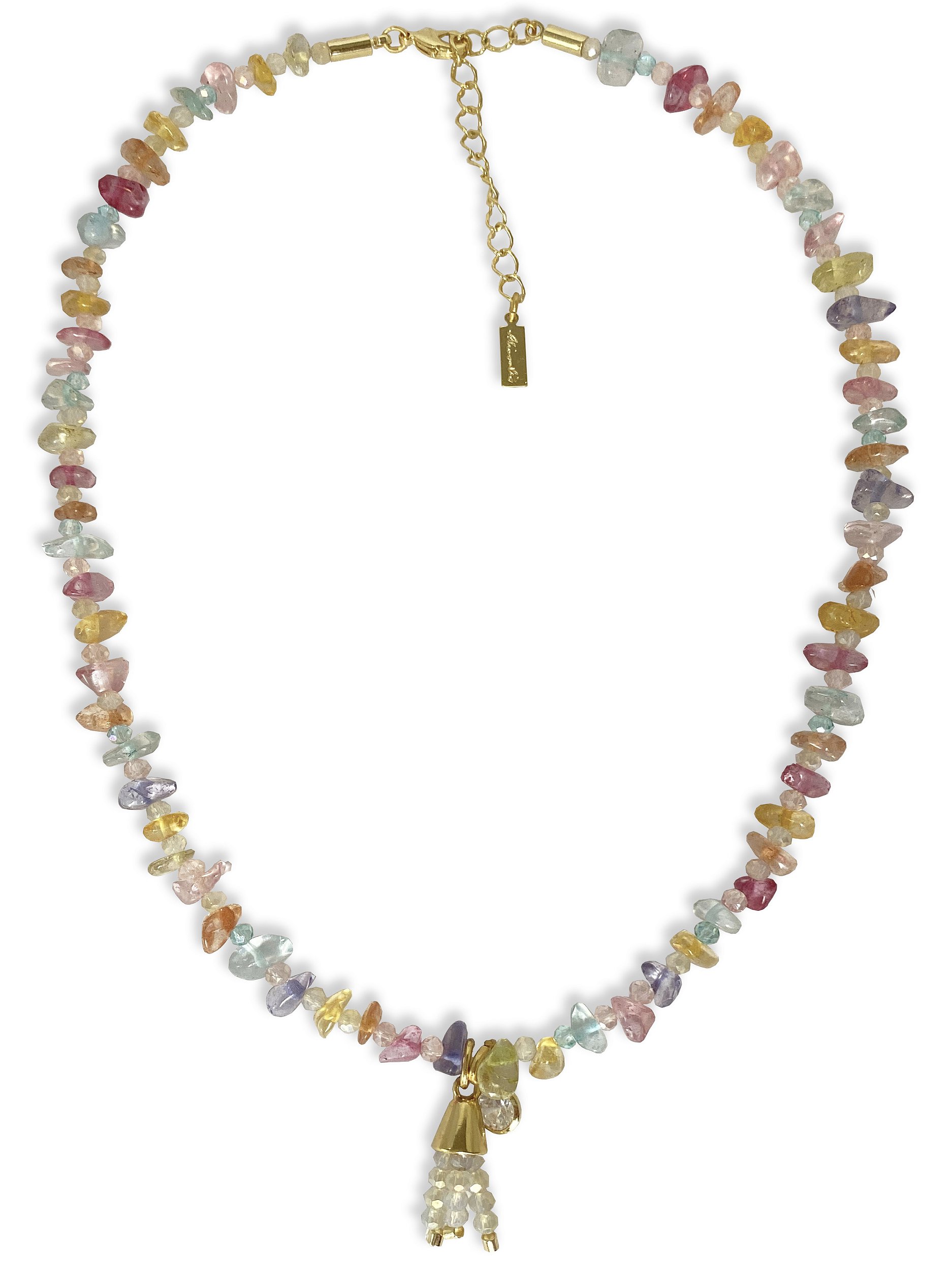 Colar confeccionado com pedras naturais em tons pastéis e metais banhados a ouro.