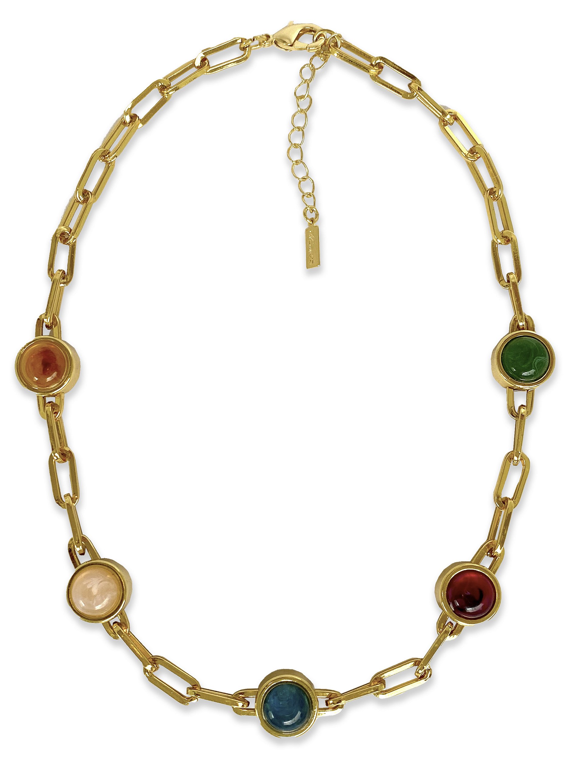 Colar curto que mistura correntaria de elos alongados com passantes resinados coloridos, criando um visual moderno e cheio de personalidade.