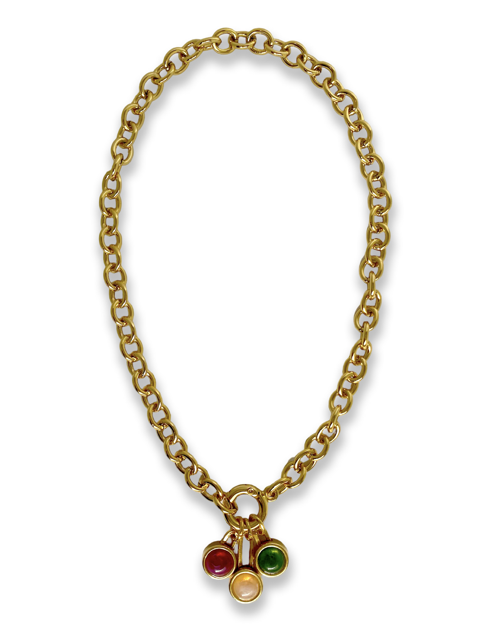 Colar confeccionado em corrente de elos redondos com pingentes resinados.