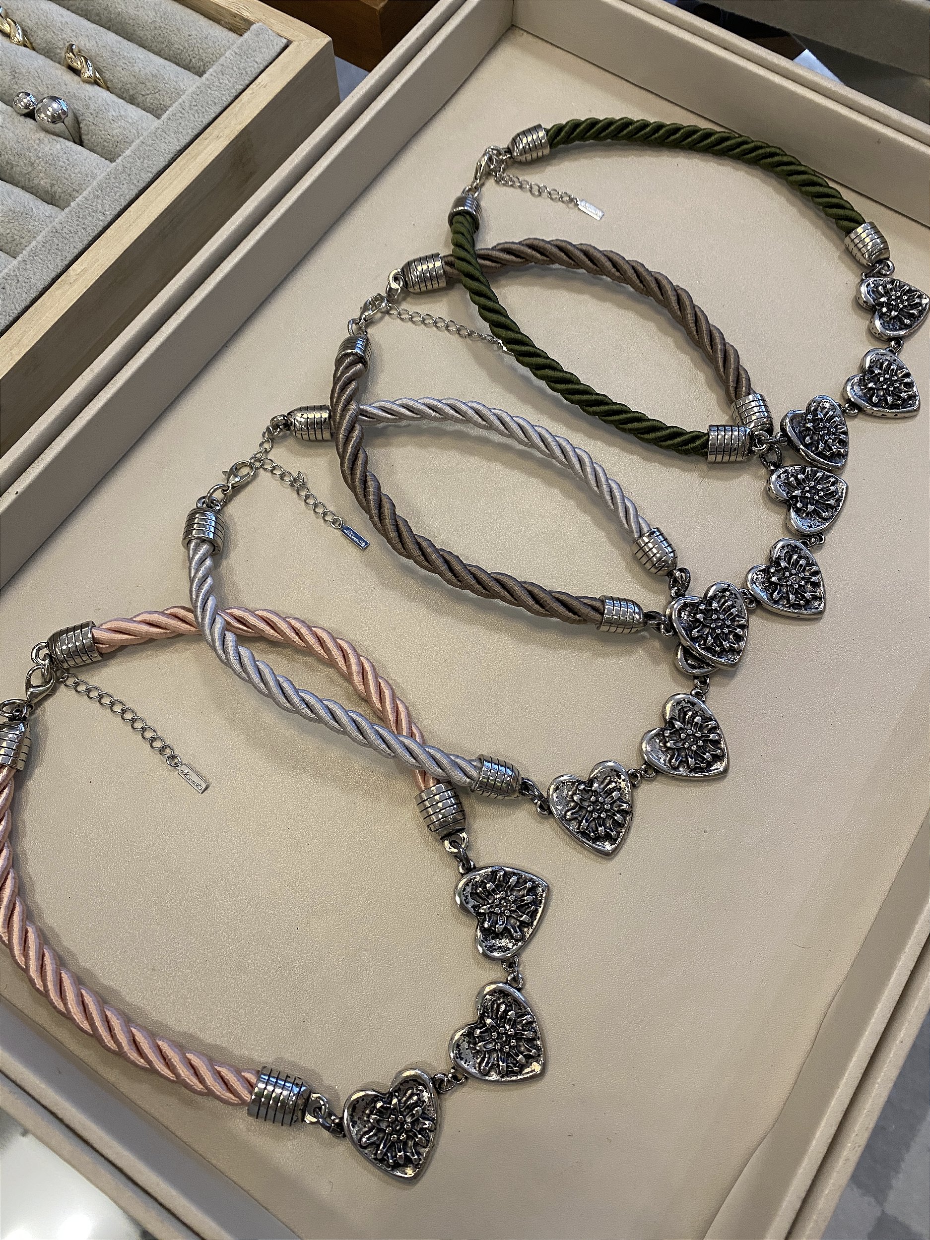 Colar confeccionado com corda São Francisco e metais em prata envelhecida, que remetem ao estilo tradicional bávaro.