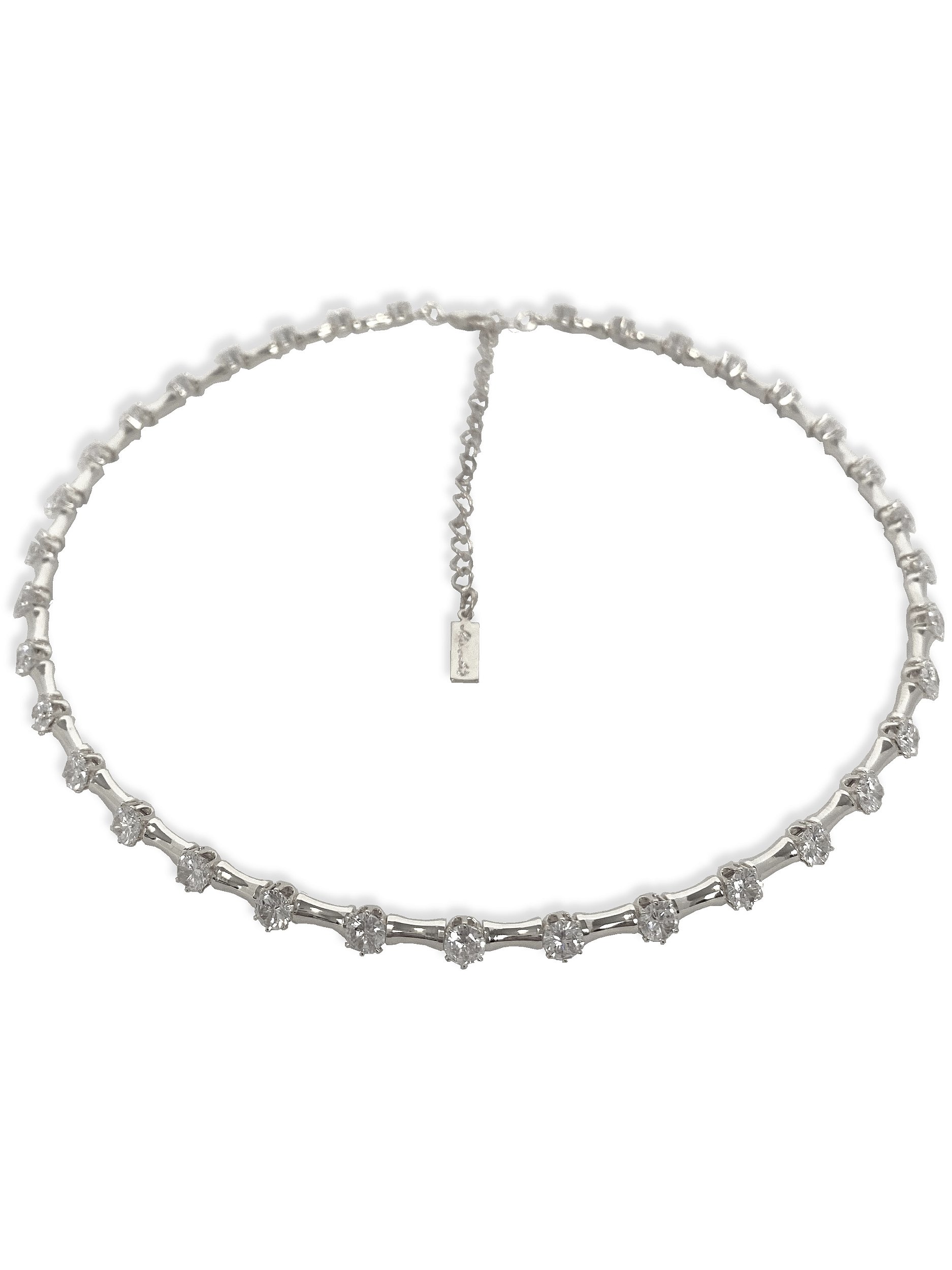 Gargantilha rígida com design sofisticado, toda cravejada em zircônias que trazem brilho e elegância ao colo.