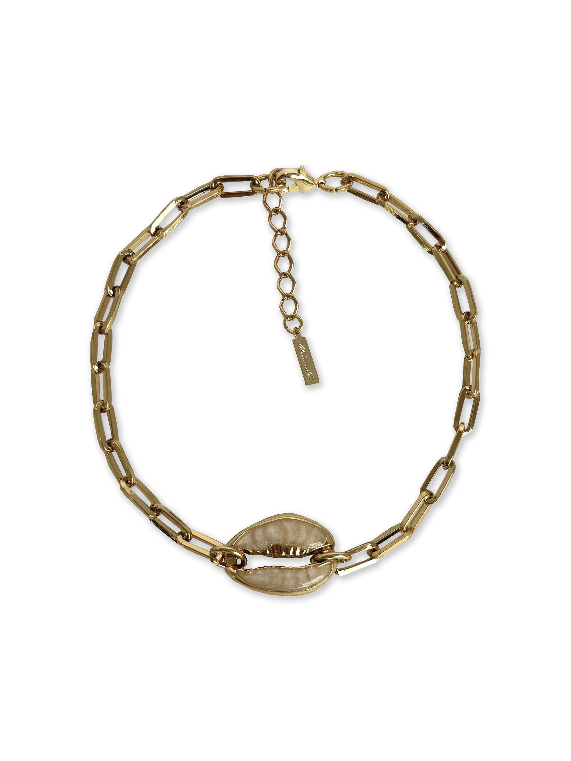 O destaque fica no pingente de búzio, trabalhado em metal banhado a ouro e preenchido com resina perolada ou resina coral, trazendo um toque fresco e sofisticado ao acessório.
