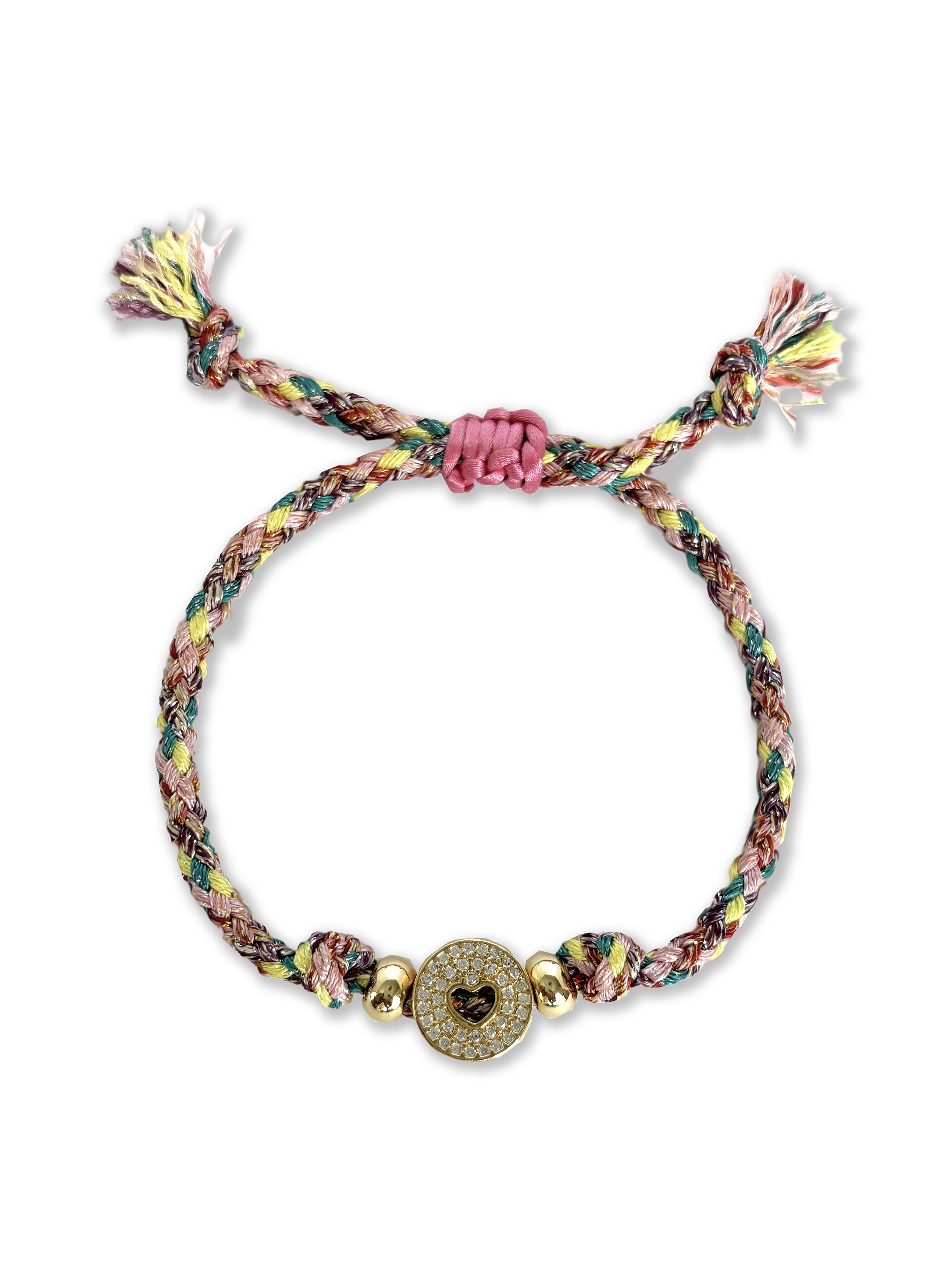 Pulseira confeccionada em cordão trançado multicolorido, vibrante e cheio de personalidade. O destaque fica por conta do passante banhado a ouro, cravejado com zircônias brilhantes e detalhe de coração vazado ao centro — um charme delicado que ilumina o visual.